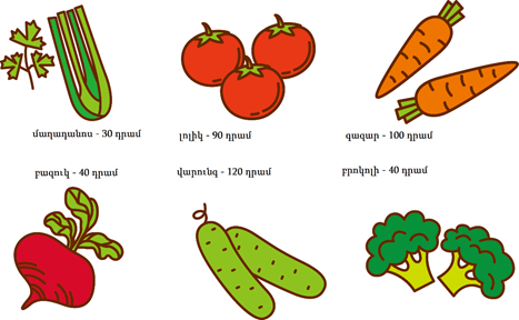| բանջարեղեն | 1 կգ արժեքը | 2 կգ արժեքը | 5 կգ արժեքը | 10 կգ արժեքը | 30 կգ արժեքը | 90 կգ արժեքը |